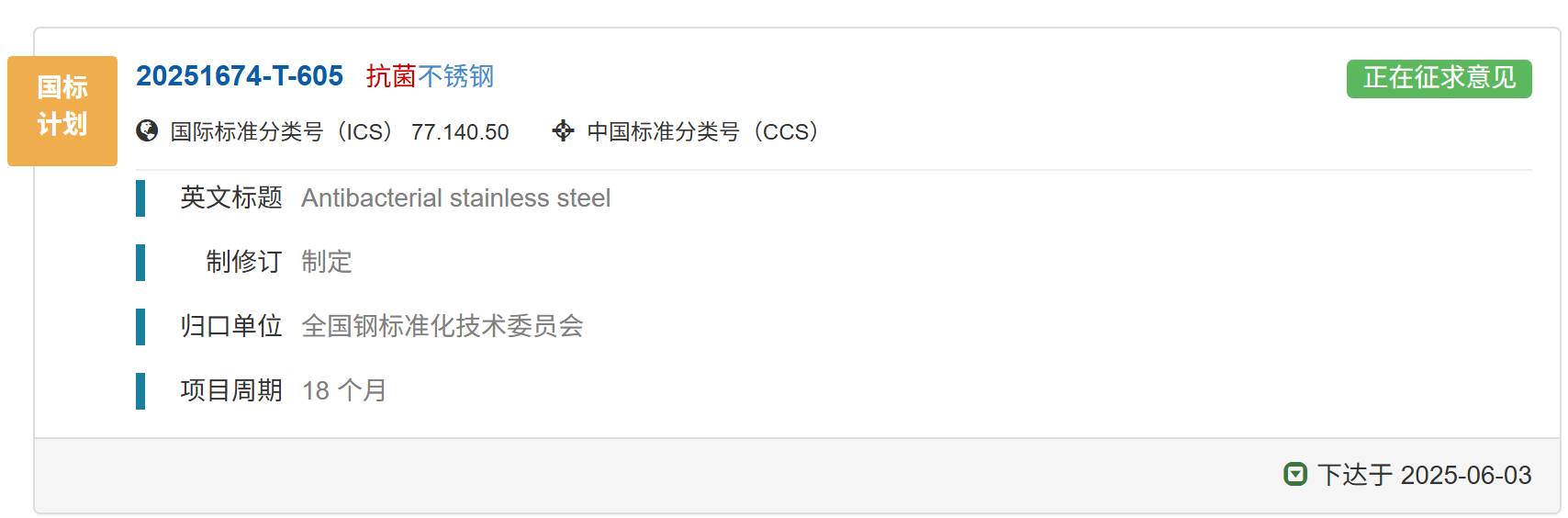 國家標(biāo)準(zhǔn)《抗菌不銹鋼》正在征求意見中,歡迎報名成為參編單位并提出修改意見和建議。01 國家標(biāo)準(zhǔn)計(jì)劃《抗菌不銹鋼》已下達(dá)國家標(biāo)準(zhǔn)計(jì)劃《